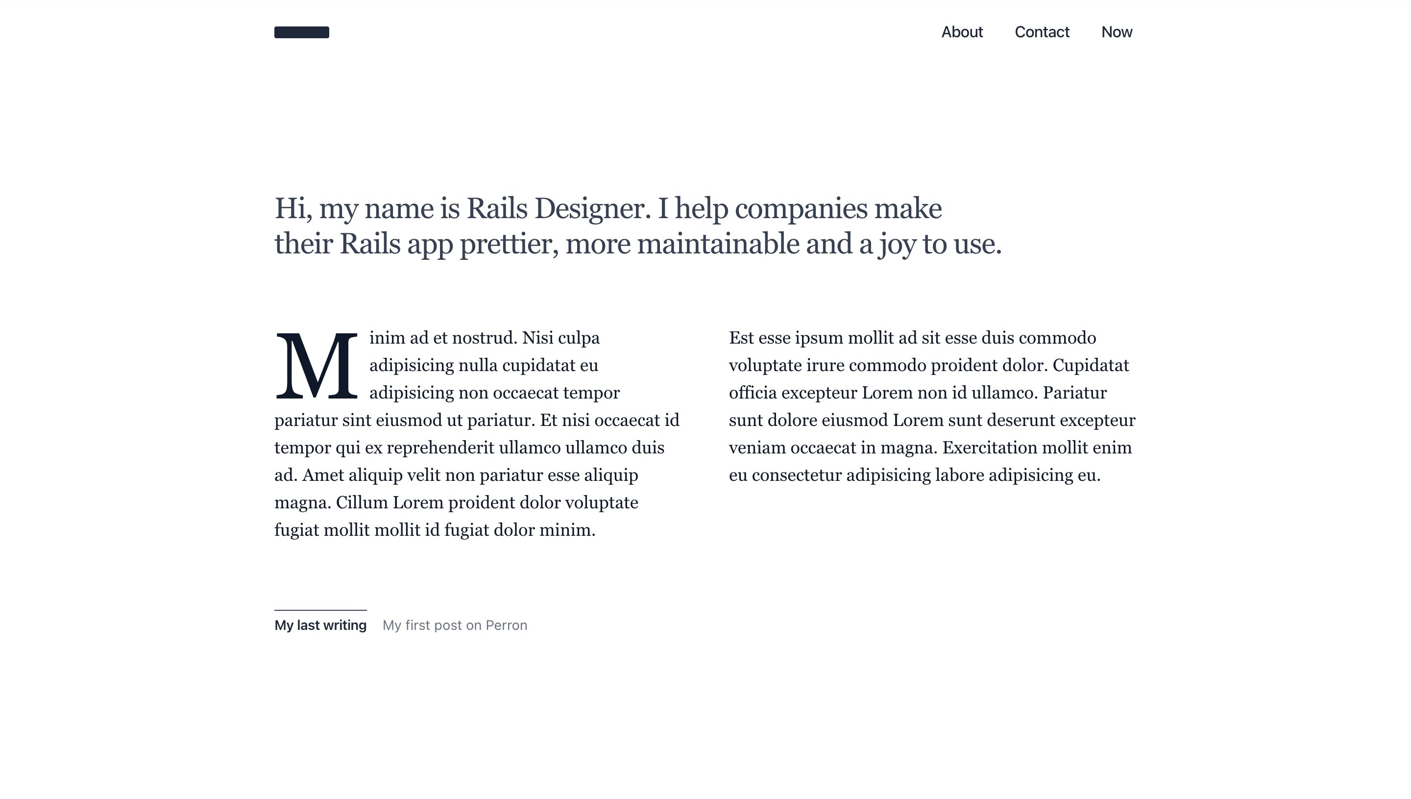 gem "tailwindcss-rails" after_bundle do rails_command "tailwindcss:install" rails_command "generate content page" rails_command "generate content post" file "app/assets/tailwind/application.css" do <<~"_" @import "tailwindcss"; @layer base { a:not([class]) { @apply underline; &:hover { @apply no-underline; } } } @layer component { .content { @apply [&_*:not(h1,h2,h3,h4,h5,h6)+*:not(pre,code,li,blockquote>p,svg),blockquote+pre]:mt-5; @apply [&_h1+p,&_h2+p,&_h3+p,&_h4+p,&_h5+p,&_h6+p]:mt-1.5; @apply [&>p,&_li]:text-base [&>p,&_li]:md:text-lg [&>p]:text-gray-950; @apply [&_*+h2,&_*+h3]:mt-8; @apply [&_h2]:font-bold [&_h2]:text-2xl [&_h2]:text-gray-800; @apply [&_h3]:font-semibold [&_h3]:text-xl [&_h3]:text-gray-800; @apply [&_h4]:font-semibold [&_h4]:text-lg [&_h4]:text-gray-800; @apply [&_ul,&_ol]:mt-2 [&_ul]:list-disc [&_ul,&_ol]:list-outside [&_ul,&_ol]:ml-4.5; @apply [&_ol]:list-decimal; @apply [&_pre]:mt-1.25 [&_pre]:px-1.5 [&_pre]:py-2 [&_pre]:sm:px-3 [&_pre]:sm:py-4 [&_pre]:rounded-md [&_pre]:overflow-auto; @apply [&_code]:p-0.5 [&_code]:text-[0.8em] [&_code]:font-medium [&_code]:bg-gray-200/70 [&_code]:rounded-sm; @apply [&_pre>code]:text-base [&_pre>code]:font-normal [&_pre>code]:text-gray-700 [&_pre>code]:bg-transparent; @apply [&_strong]:font-semibold; @apply [&_table]:w-full [&_table]:text-left [&_table]:text-base; @apply [&_thead]:border-b [&_thead]:border-gray-200; @apply [&_th]:px-2 [&_th]:py-1.5 [&_th]:font-semibold [&_th]:text-gray-800; @apply [&_tbody_tr]:border-b [&_tbody_tr]:border-gray-100; @apply [&_tbody_tr:last-child]:border-0; @apply [&_td]:px-2 [&_td]:py-1.5 [&_td]:text-base [&_td]:sm:text-lg [&_td]:text-gray-800; @apply marker:text-gray-500; } } _ end file "app/content/data/README.md" do <<~"_" # Data Perron can consume structured data from YML, JSON, or CSV files, making them available within your templates. This is useful for populating features, team members, or any other repeated data structure. ## Usage To use a data file, you can access it through the `Perron::Site.data` object followed by the basename of the file: ```erb <% Perron::Site.data.features.each do |feature| %> <h4><%= feature.name %></h4> <p><%= feature.description %></p> <% end %> ``` This is a convenient shorthand for `Perron::Data.new("features")`, which can also be used directly: ```ruby <% Perron::Data.new("features").each do |feature| %> <h4><%= feature.name %></h4> <p><%= feature.description %></p> <% end %> ``` ## File Location and Formats By default, Perron looks up `app/content/data/` for files with a `.yml`, `.json`, or `.csv` extension. For a `new("features")` call, it would find `features.yml`, `features.json`, or `features.csv`. You can also provide a full, absolute path to any data file, like `Perron::Data.new("path-to-some-data-file")`. ## Accessing Data The wrapper object provides flexible, read-only access to each record's attributes. Both dot notation and hash-like key access are supported. ```ruby feature.name feature[:name] ``` ## Rendering You can render data collections directly using Rails-like partial rendering. When you call `render` on a data collection, Perron will automatically render a partial for each item. ```erb <%= render Perron::Site.data.features %> ``` This expects a partial at `app/views/content/features/_feature.html.erb` that will be rendered once for each feature in your data file. The individual record is made available as a local variable matching the singular form of the collection name. ```erb <!-- app/views/content/features/_feature.html.erb --> <div class="feature"> <h4><%= feature.name %></h4> <p><%= feature.description %></p> </div> ``` _ end file "app/content/data/social_links.yml" do <<~"_" - name: Social X url: "https://example.com" - name: Social Y url: "https://example.com" - name: Social Z url: "https://example.com" _ end file "app/content/pages/about.erb" do <<~"_" --- nav_label: About title: About me description: description --- <article class="max-w-4xl mx-auto mt-16 px-2"> <h1 class="text-2xl font-sans font-bold text-gray-700 md:text-balance md:text-4xl md:tracking-tight"> <%= @resource.title %> </h1> <p class="mt-5 text-lg text-gray-800 md:text-2xl max-w-prose md:mt-8"> Minim ad et nostrud. Nisi culpa adipisicing nulla cupidatat eu adipisicing non occaecat tempor pariatur sint eiusmod ut pariatur. Et nisi occaecat id tempor qui ex reprehenderit ullamco ullamco duis ad. Amet aliquip velit non pariatur esse aliquip magna. Cillum Lorem proident dolor voluptate fugiat mollit mollit id fugiat dolor minim. </p> <p class="mt-5 text-lg text-gray-800 md:text-2xl max-w-prose md:mt-8"> Est esse ipsum mollit ad sit esse duis commodo voluptate irure commodo proident dolor. Cupidatat officia excepteur Lorem non id ullamco. Pariatur sunt dolore eiusmod Lorem sunt deserunt excepteur veniam occaecat in magna. Exercitation mollit enim eu consectetur adipisicing labore adipisicing eu. </p> </article> _ end file "app/content/pages/contact.erb" do <<~"_" --- nav_label: Contact title: Contact description: description --- <article class="max-w-4xl mx-auto mt-16 px-2"> <h1 class="text-2xl font-sans font-bold text-gray-700 md:text-balance md:text-4xl md:tracking-tight"> <%= @resource.title %> </h1> <p class="mt-5 text-lg text-gray-800 md:text-2xl max-w-prose md:mt-8"> Want to say? Have a question? <%= mail_to "me@example.com", "Send me an email" %> or find me on a platform below. </p> <ul class="flex flex-col gap-y-1 mt-5 text-lg"> <%= render Perron::Site.data.social_links %> </ul> </article> _ end file "app/content/pages/now.erb" do <<~"_" --- nav_label: Now title: What am I doing now? description: description updated_at: 2025-01-01T00:00:00Z doing: - Mastering Blender 3D's geometry nodes system - Writing a book on sustainable design practices - Learning Thai language (currently at B1 level) - Building a hydroponic garden in my apartment --- <article class="max-w-4xl mx-auto mt-16 px-2"> <h1 class="text-2xl font-sans font-bold text-gray-700 md:text-balance md:t